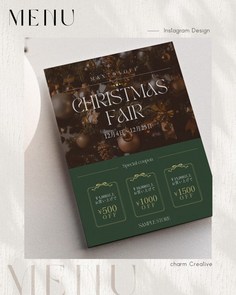 ショップのブランドイメージを損なわないよう、クリスマス感はありつつも大人の雰囲気を重要視したフォント選びや写真素材を選び